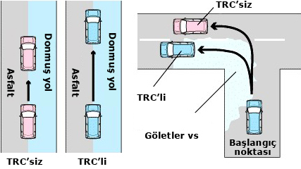 Aracın kalkışı sırasında sol ve sağ tekerlek için yol koşulları farklılık gösterdiğinde, motor sürüş gücü, patinaja meyilli lastiğe verilir. Bunun önlenmesi için, sistem kayan tekerleğe fren uygular ve diğer lastiğe sürüş gücü verir.