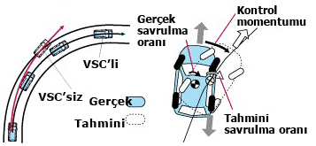 Dönüş esnasında savrulma oranı aşırı olduğunda, VSC bunu aracın virajda içe kayması olarak algılar. Bu durumda, ön dış tekerlek için fren etkinleştirilir ve dışa doğru momentum yaratılır. Bu, arka tekerleğin yana kaymasını önler.